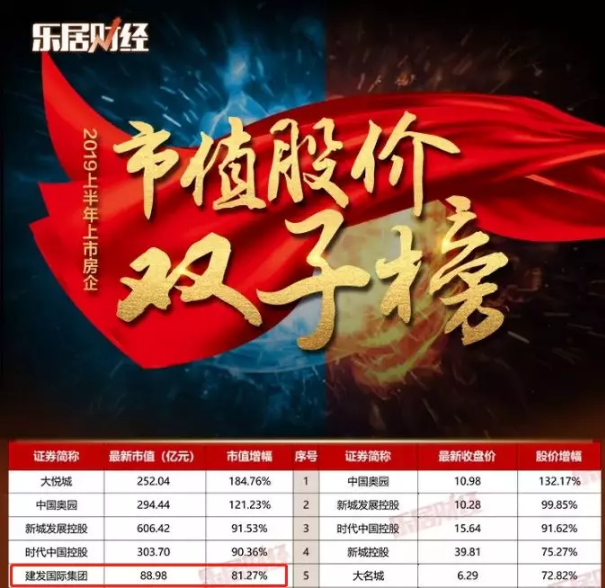 2019年上半年收官,,,,,,,,恒生指数上半年收涨10.55%,,,,,,,,上市房企也交出了一份期中考卷。。。。。。克日,,,,,,,,乐居财经收罗136家上市房企数据,,,,,,,,推出《2019年上半年上市房企市值股价双子榜》,,,,,,,,总结上市房企资源市场战绩。。。。。。